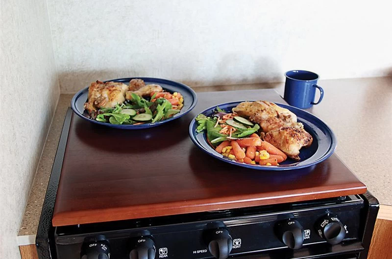 Universal Bordeaux Silent Top with Flexible Cutting Mat by Camco®. Camco RV Universal Stovetop Cover silences annoying stovetop rattles and adds valuable counter space to your RV. Solid hardwood stovetop cover hides and protects burners. Non-toxic gloss finish for extra moisture protection.