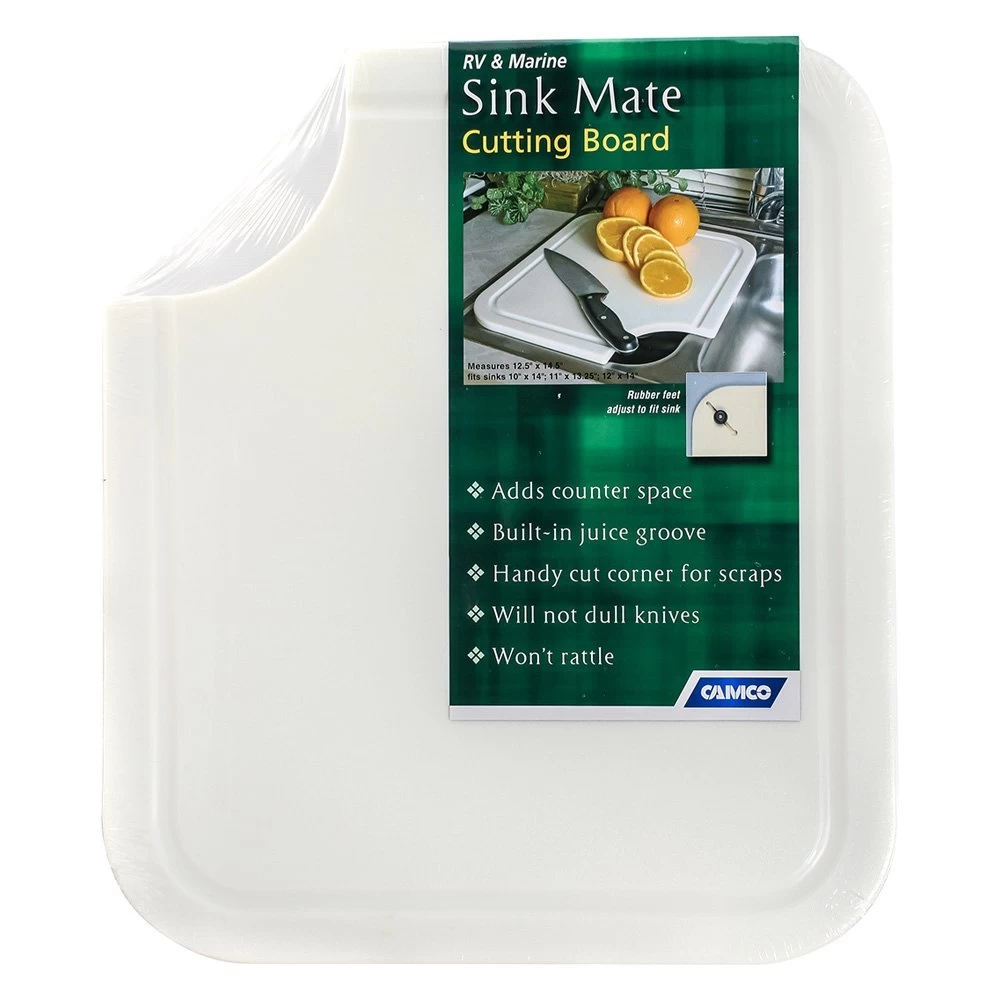White Plastic Sink Mate Cutting Board by Camco®. Sits on top of your RV’s or boat’s kitchen sink to increase work space. It is ideal for cleaning, carving and chopping. Won’t nick or dull knives. Features a cut corner for scraps and a built-in juice groove. Adjustable rubber feet adapt to your sink size.