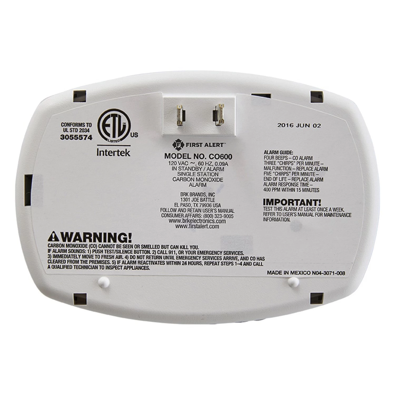 The First Alert CO600 Carbon Monoxide Alarm is easy to set up. Simply plug the alarm into any standard electrical outlet, and the CO detector will start to monitor your space for carbon monoxide. Remember to test your CO detector regularly and change the batteries at least twice a year. The First Alert CO600 Carbon Monoxide Alarm is easy to set up. Simply plug the alarm into a 120-volt wall outlet, and the CO detector will start to monitor your space for carbon monoxide. There are no complicated displays or settings to navigate-a single button silences the alarm and tests the CO detector. A pull-down action chart instructs you in what to do if the CO alarm goes off.